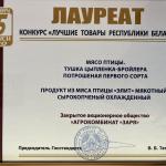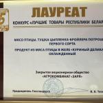 Лучшие товары ЗАО "Агрокомбинат "Заря" стало лауреатом конкурса "Лучшее товары Республики Беларусь на рынке Российской Федерации" - за тушку цыпленка-бройлера 1-го сорта. Диплом руководителю предприятия Корневу Александру Николаевичу вручил председатель Могилевского областного исполнительного комитета Доманевский Владимир Викторович. |